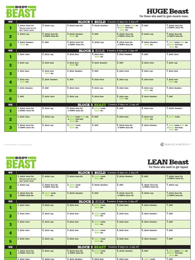 Depending on which workout calendar you choose, you'll do different workouts to make sure you are weight training in an effective way each day. There are 2 specific body beast workout schedules to pick from: Mar 30, 2021 · how long is each body beast schedule? Each of the workout schedules are 90 days long. See full list on workoutscheduler.net What is the body beast schedule? Jul 22, 2021 · total body workout: To reduce injury risk, start with lighter weights. And review the book of beast before beginning. I will say that the build phase definitely has some of the longer workouts. This is all about building the foundation. Is body beast good workout for women? That means muscle that work together like chest and triceps, back and biceps, etc…what these training series allow you to do is get strong and build a solid foundation to work on.